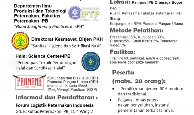 Bogor(11/12), Fakultas Peternakan IPB bekerjasama dengan FLPI menyelenggarakan Pelatihan "Manajemen dan Sistem Penjaminan Mutu RPH serta Kunjungan ke RPH Pramana Pangan Utama-Fapet IPB". Kegiatan berlangsung dari pagi hingga sore hari. Sesi pagi hingga siang dilaksanakan di ruang sidang Fakultas Peternakan IPB.